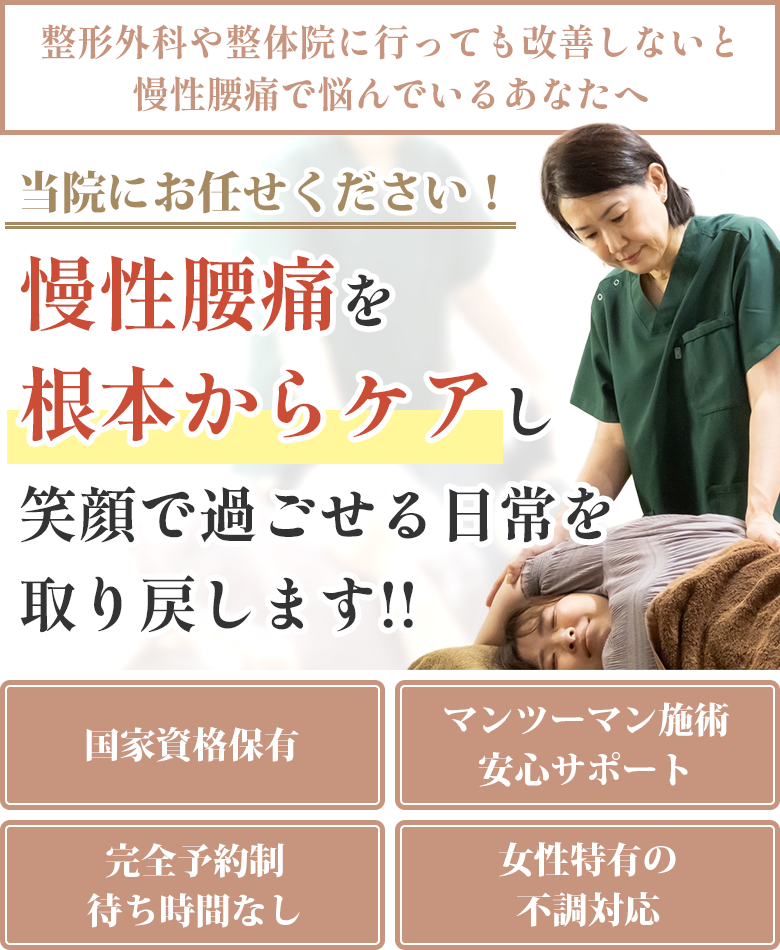 多くの方が「ずっと腰が重い」「動き始めがつらい」「長く立つ・座るがしんどい」といった悩みを抱えており、家事・育児・仕事にまで影響しやすいのが慢性腰痛の特徴です。