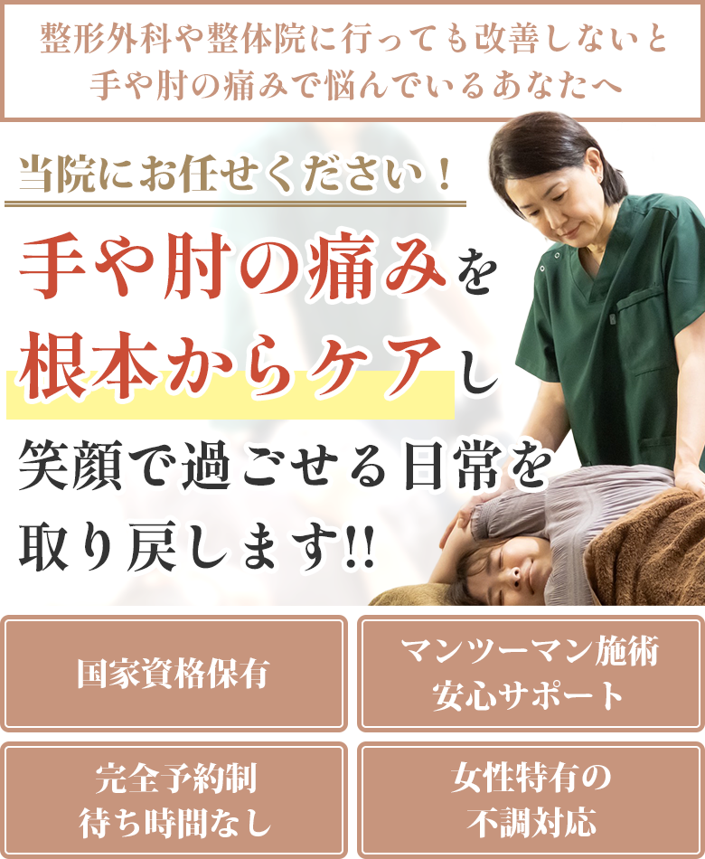 手も痛かったんですけど、膝も痛い、肩も凝る、腰も痛いなどいろんな部位が痛くて辛かったのですが、こちらに通うようになってだんだん痛みが無くなって、それと同時に手の方も良くなったと言う感じです。