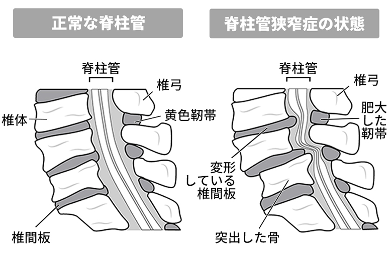 脊柱管狭窄症とは、神経の背中側にある黄色靭帯が分厚くなったり、椎体と椎体の間にある椎間板が突出してヘルニアとなったり、あるいは骨そのものが変形突出したりすることで脊柱管が狭くなった状態のことを指します。